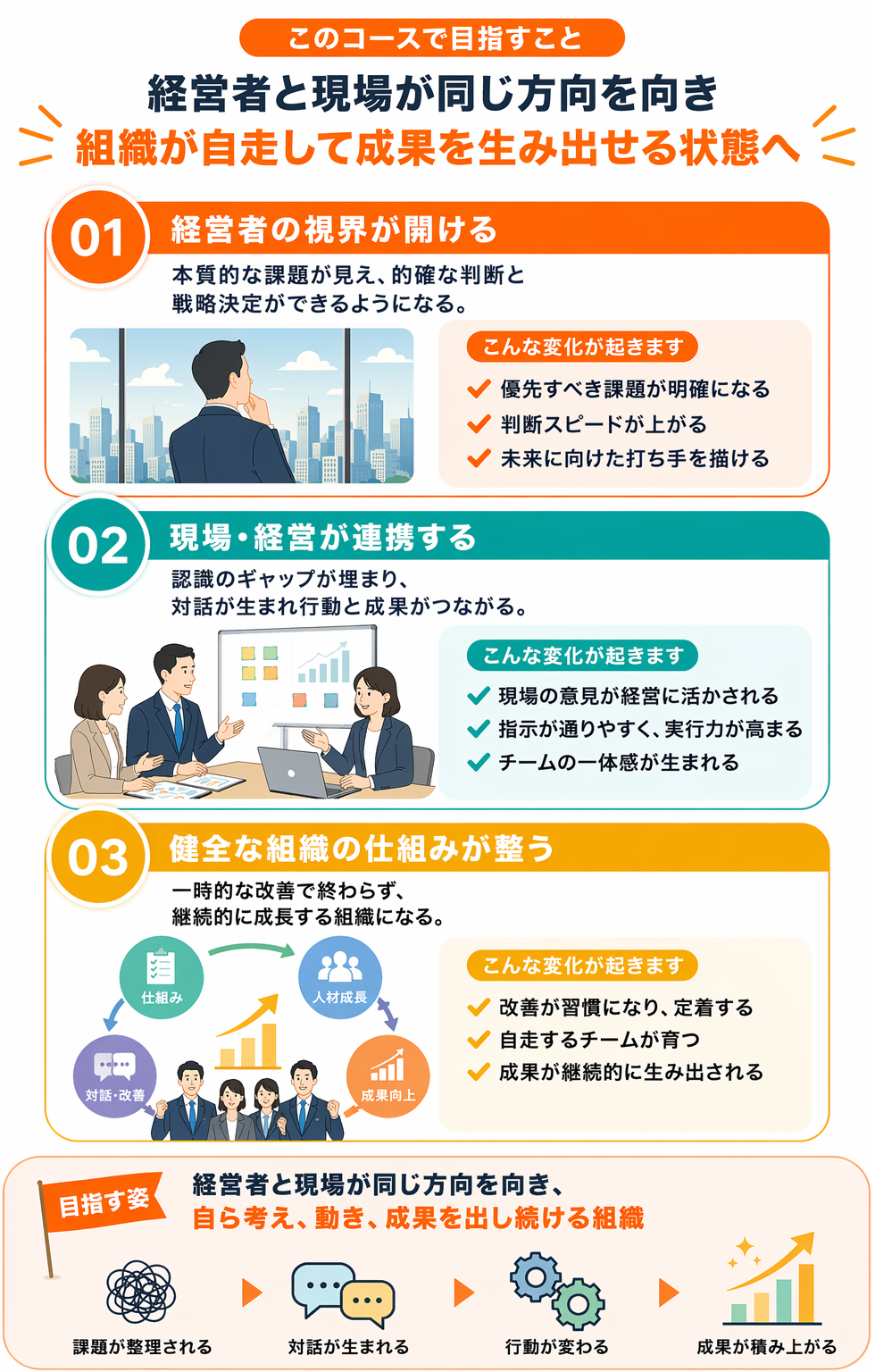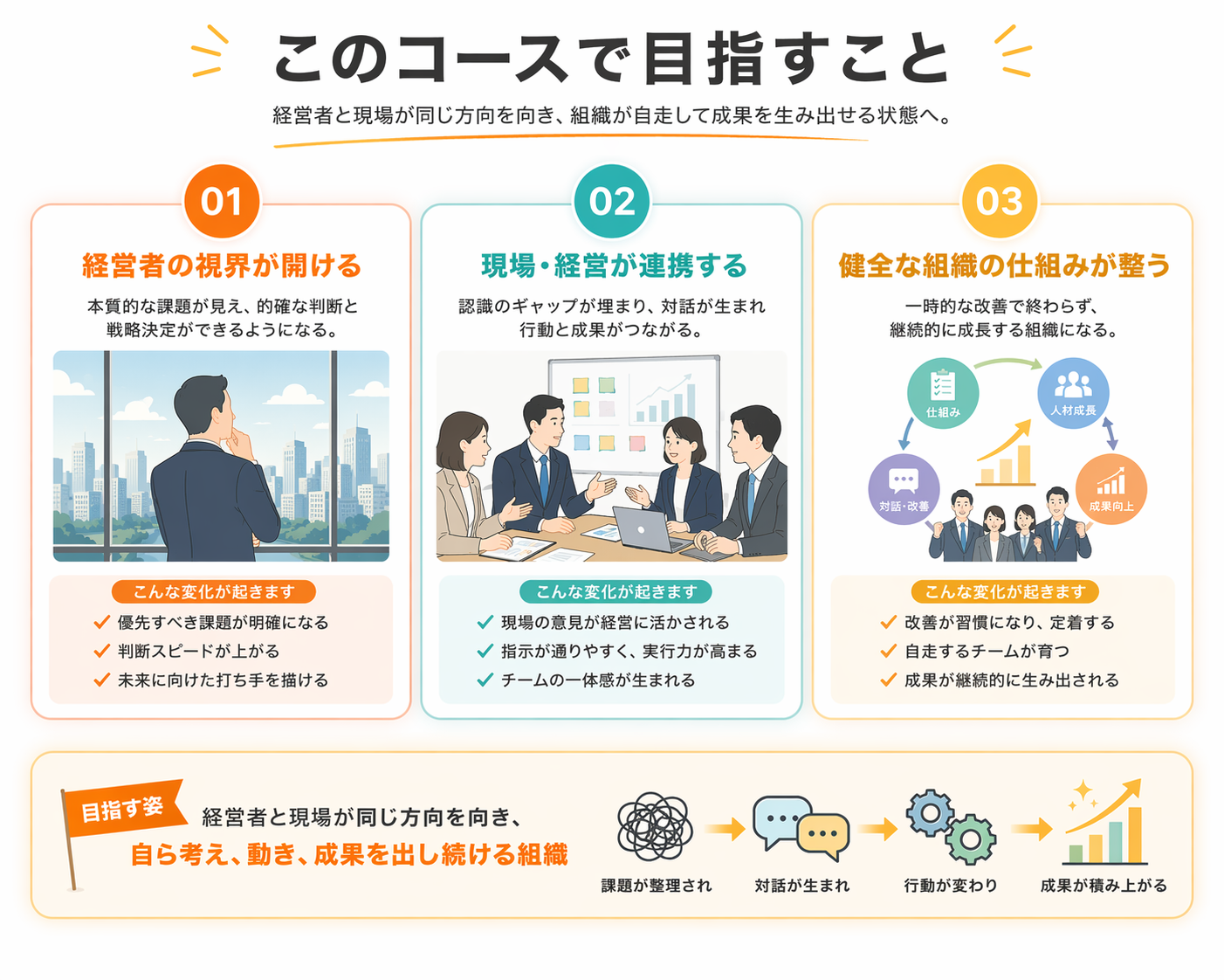 経営者の行動が変わり、組織の反応が変わり、業績にも確かな変化が生まれます。