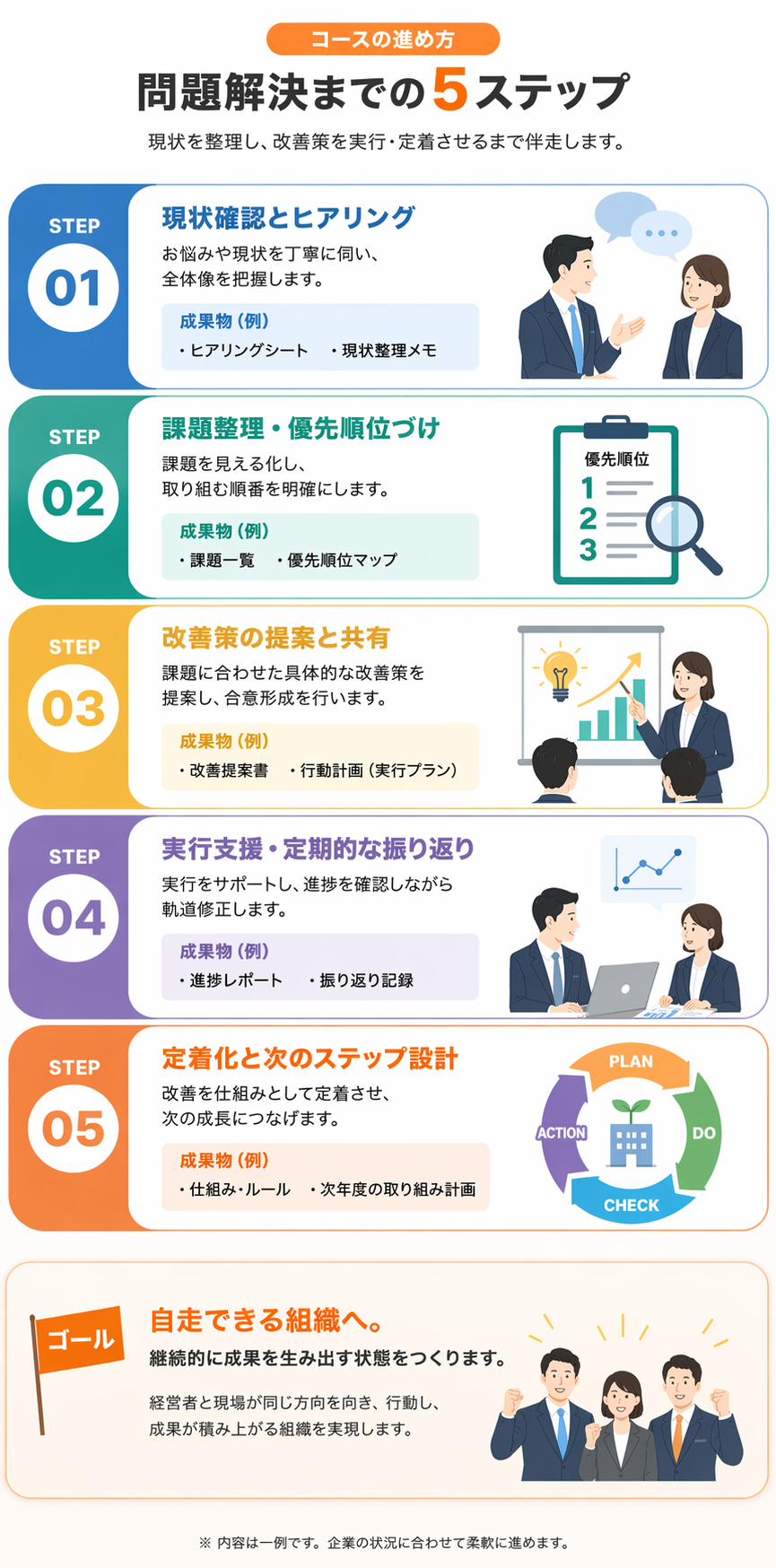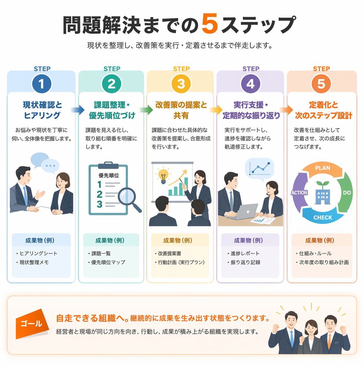 改善案を出して終わりではなく、「やり切れる仕組みづくり」まで共に進めます。