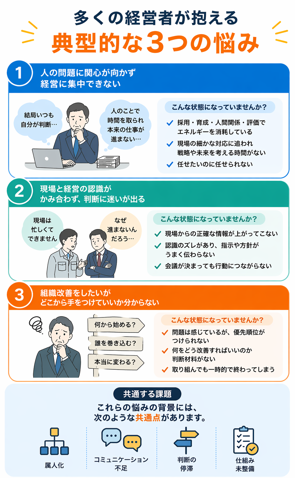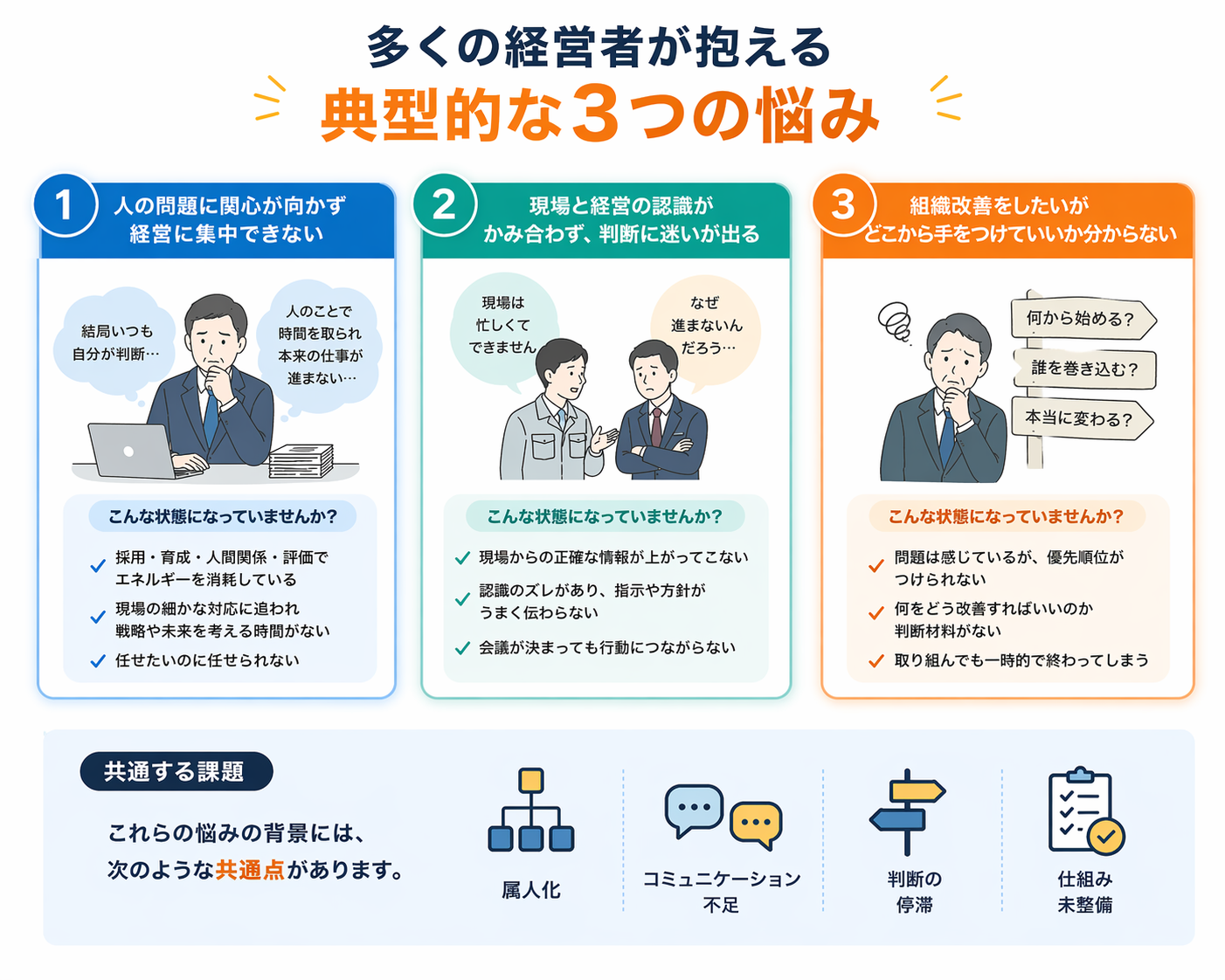 - 現場と経営の認識がかみ合わず、判断に迷いやすい